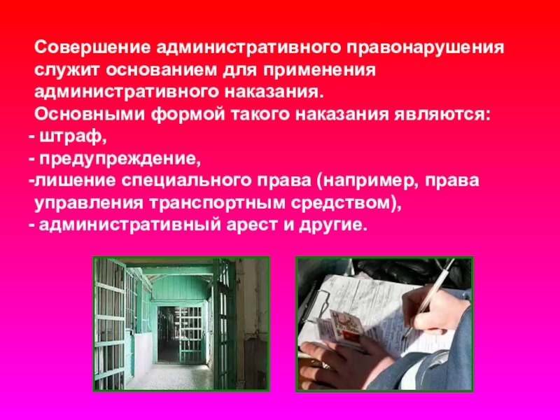 Совершение административного правонарушения служит основанием для применения административного наказания. Основными формой такого наказания являются: штраф, предупреждение, лишение