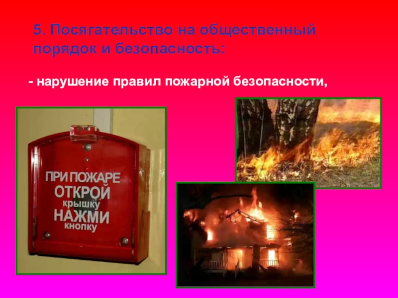 5. Посягательство на общественный порядок и безопасность: нарушение правил пожарной безопасности,