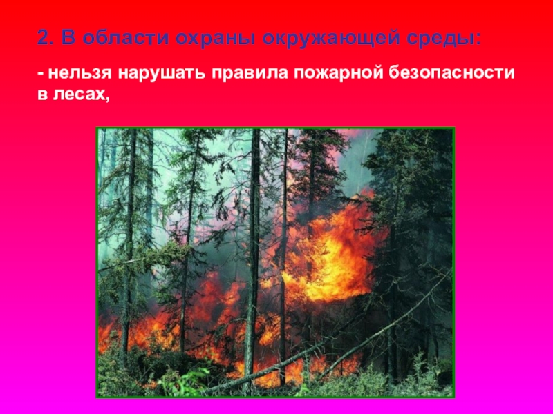 2. В области охраны окружающей среды: - нельзя нарушать правила пожарной безопасности в лесах,
