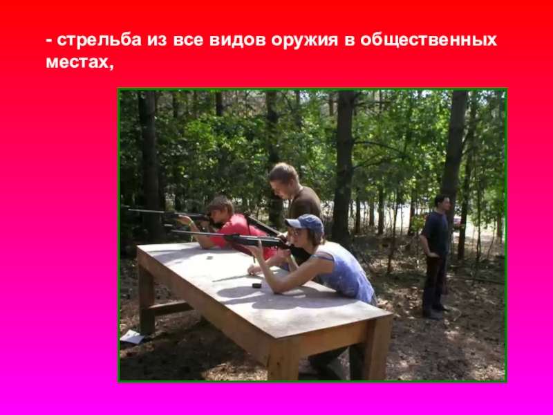 Слайд 17- стрельба из все видов оружия в общественных местах,