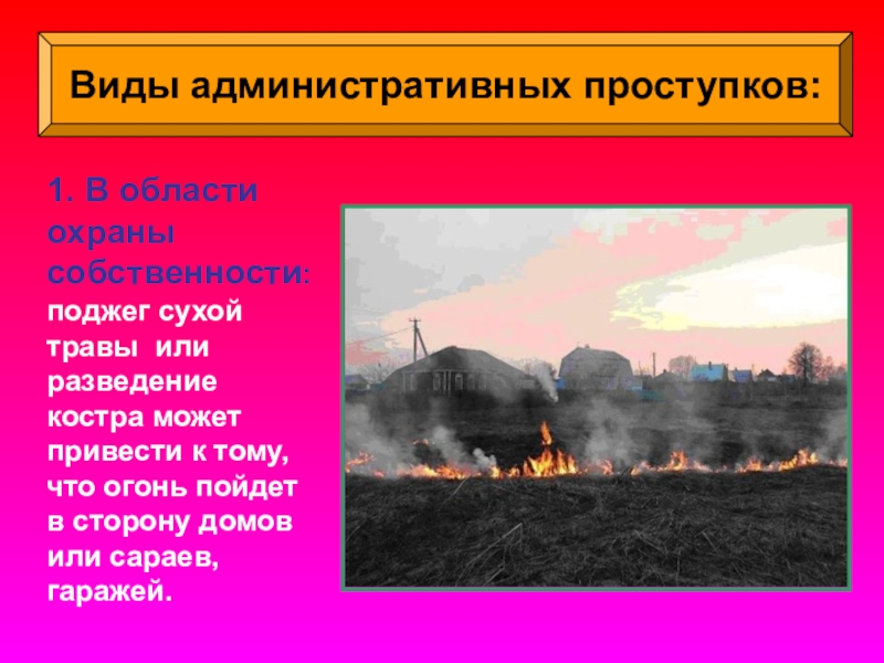 Виды административных проступков:1. В области охраны собственности: поджег сухой травы или разведение костра может привести к тому,