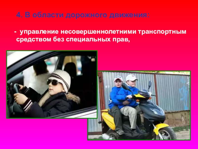 4. В области дорожного движения:  управление несовершеннолетними транспортным средством без специальных прав,