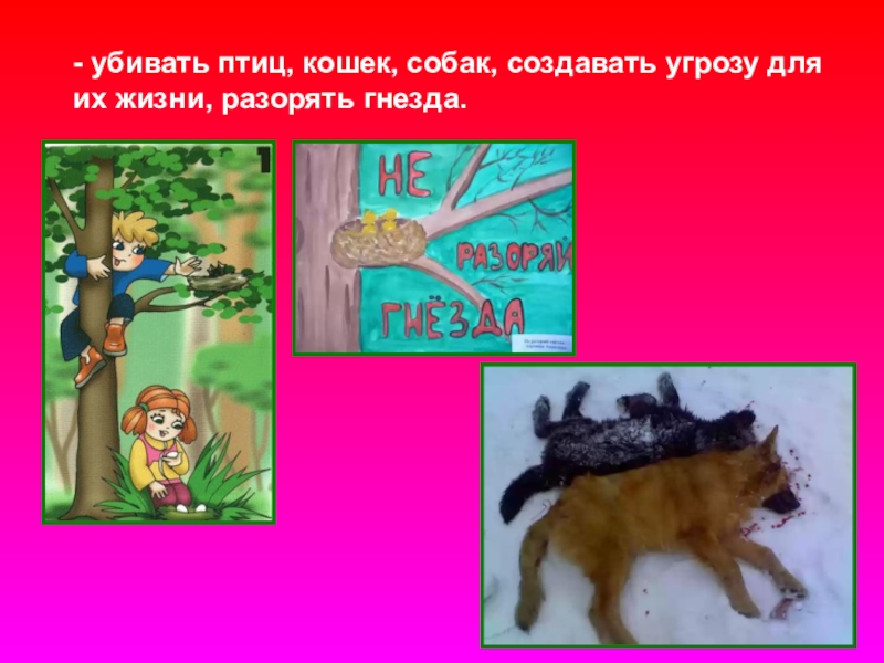 Слайд 9- убивать птиц, кошек, собак, создавать угрозу для их жизни, разорять