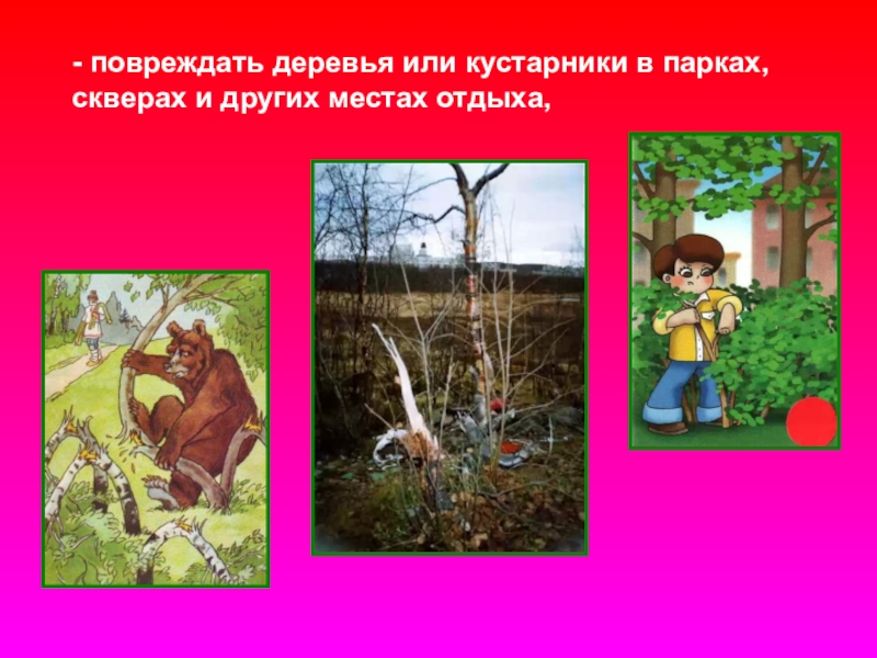 Слайд 7- повреждать деревья или кустарники в парках, скверах и других местах