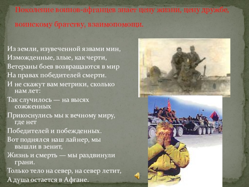 Поколение воинов-афганцев знает цену жизни, цену дружбе, воинскому братству, взаимопомощи.