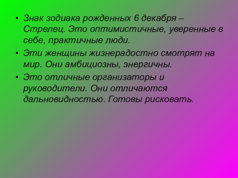 Слайд 11Знак зодиака рожденных 6 декабря – Стрелец. Это оптимистичные, уверенные в