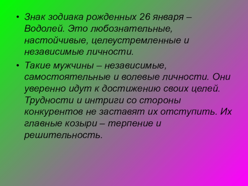 Слайд 41Знак зодиака рожденных 26 января – Водолей. Это любознательные, настойчивые, целеустремленные