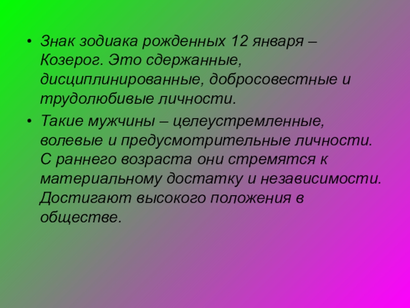 Слайд 33Знак зодиака рожденных 12 января – Козерог. Это сдержанные, дисциплинированные, добросовестные