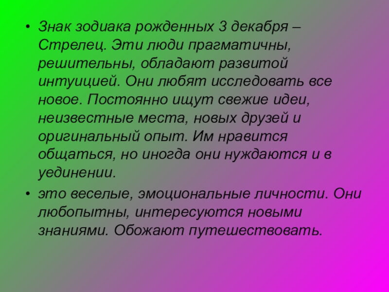 Слайд 5Знак зодиака рожденных 3 декабря – Стрелец. Эти люди прагматичны, решительны,