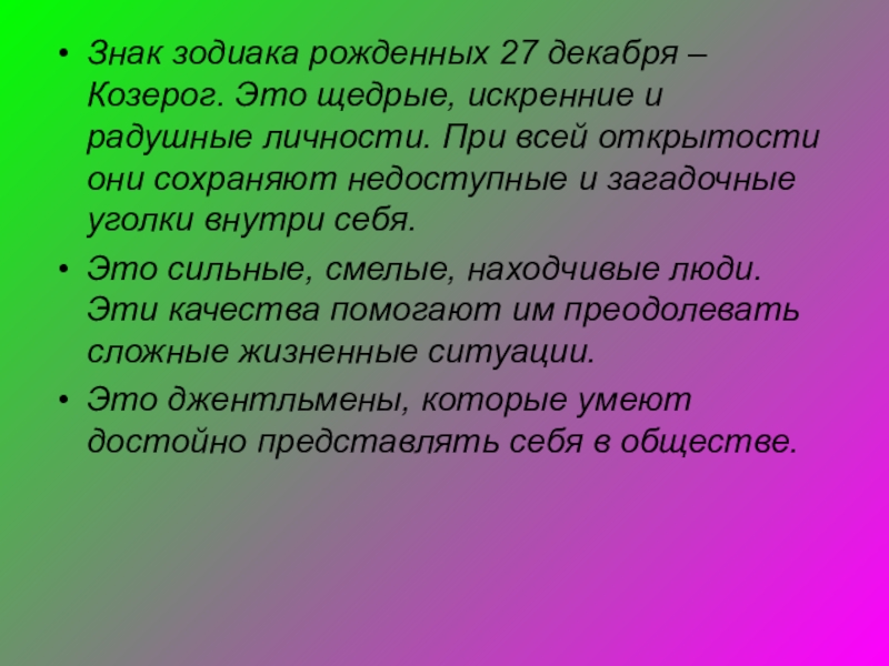 Слайд 21Знак зодиака рожденных 27 декабря – Козерог. Это щедрые, искренние и