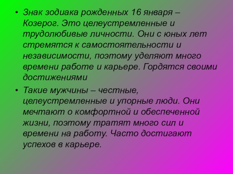 Слайд 37Знак зодиака рожденных 16 января – Козерог. Это целеустремленные и трудолюбивые