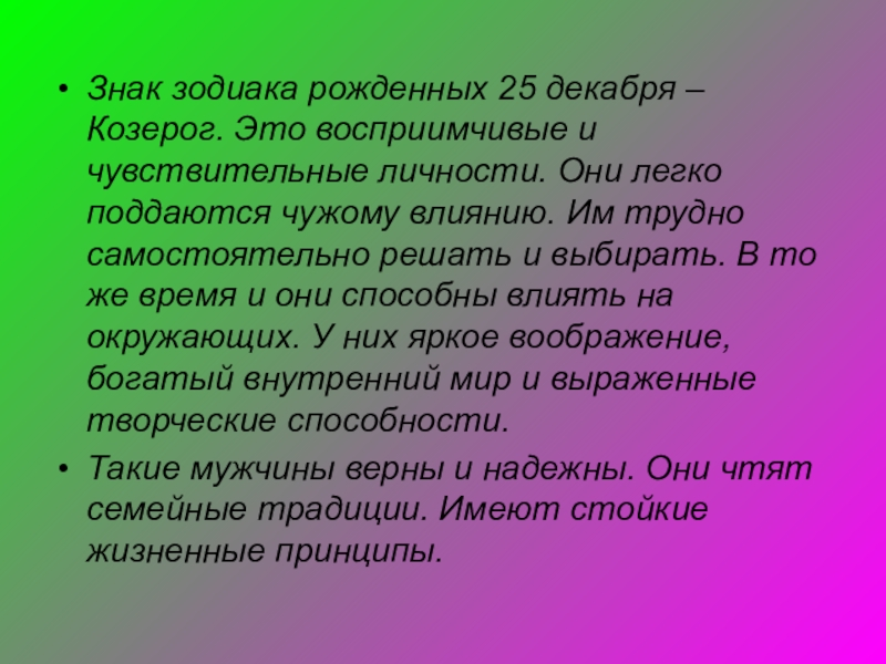 Слайд 18Знак зодиака рожденных 25 декабря – Козерог. Это восприимчивые и чувствительные
