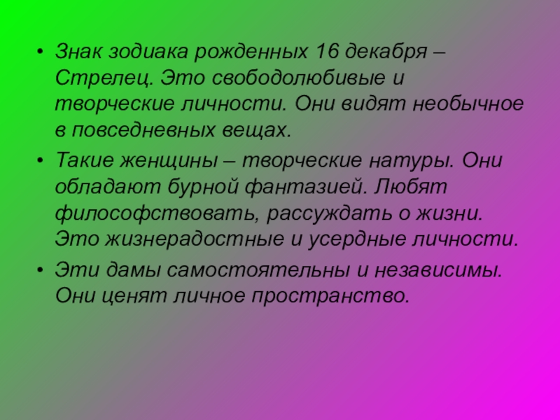 Слайд 25Знак зодиака рожденных 16 декабря – Стрелец. Это свободолюбивые и творческие