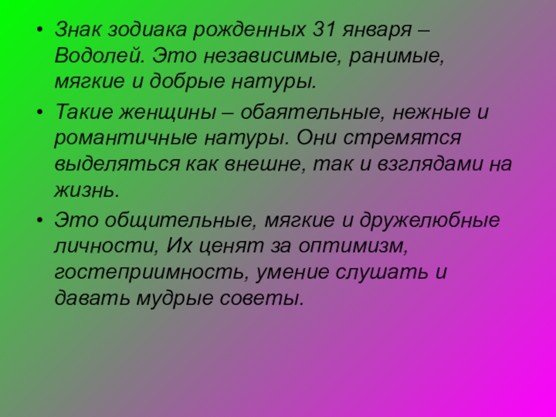 Слайд 45Знак зодиака рожденных 31 января – Водолей. Это независимые, ранимые, мягкие