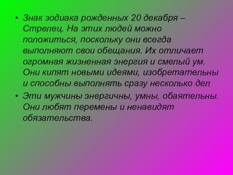 Слайд 15Знак зодиака рожденных 20 декабря – Стрелец. На этих людей можно