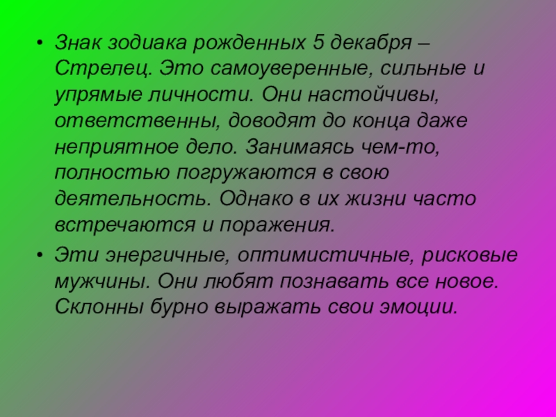 Слайд 9Знак зодиака рожденных 5 декабря – Стрелец. Это самоуверенные, сильные и