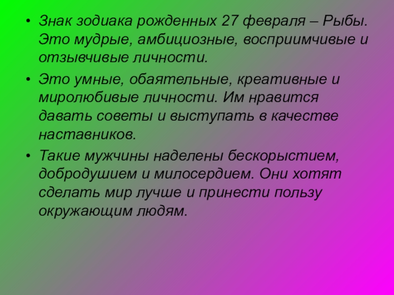 Слайд 52Знак зодиака рожденных 27 февраля – Рыбы. Это мудрые, амбициозные, восприимчивые