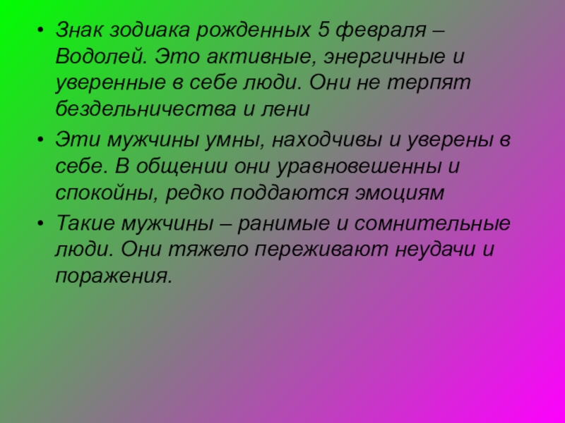 Слайд 48Знак зодиака рожденных 5 февраля – Водолей. Это активные, энергичные и