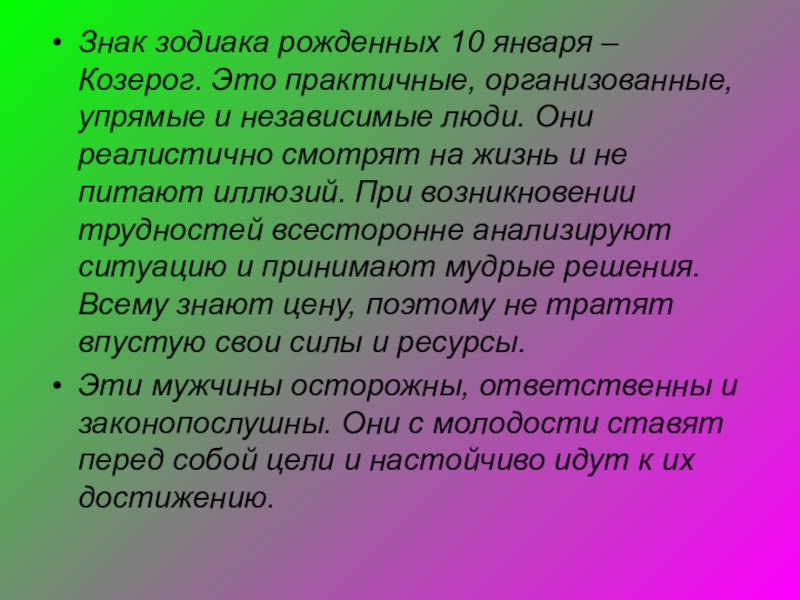 Слайд 29Знак зодиака рожденных 10 января – Козерог. Это практичные, организованные, упрямые