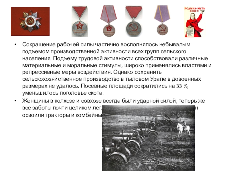 сельского населения. Подъему трудовой активности способствовали различные материальные и моральные стимулы, широко применялись властями и репрессивные меры воздействия. Однако сохранить сельскохозяйственное производство в тыловом Урале в довоенных размерах не удалось. Посевные площади сократились на 33 %, уменьшилось поголовье скота.