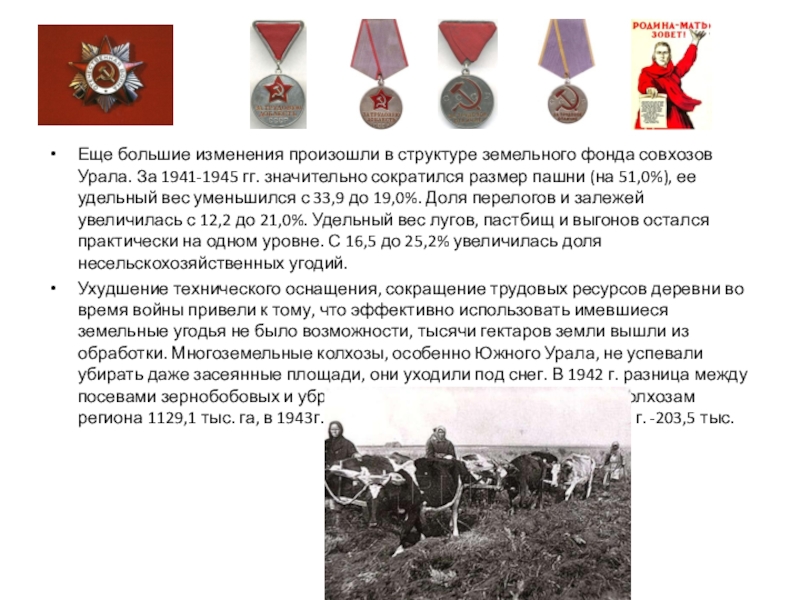 Слайд 3Общий земельный фонд на Урале в годы войны не изменился. Сокращение