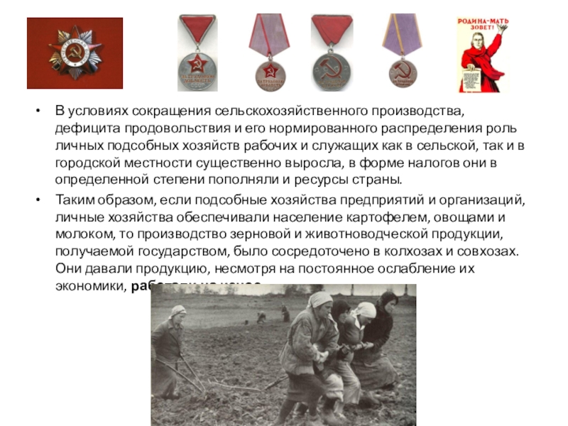 роль личных подсобных хозяйств рабочих и служащих как в сельской, так и в городской местности существенно выросла, в форме налогов они в определенной степени пополняли и ресурсы страны.