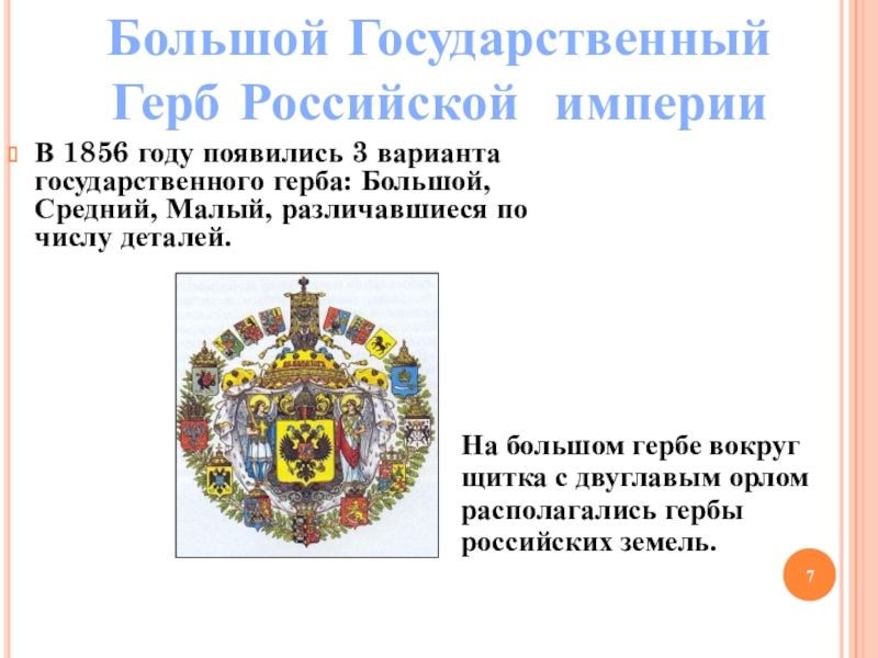 На большом гербе вокруг щитка с двуглавым орлом располагались гербы российских земель.