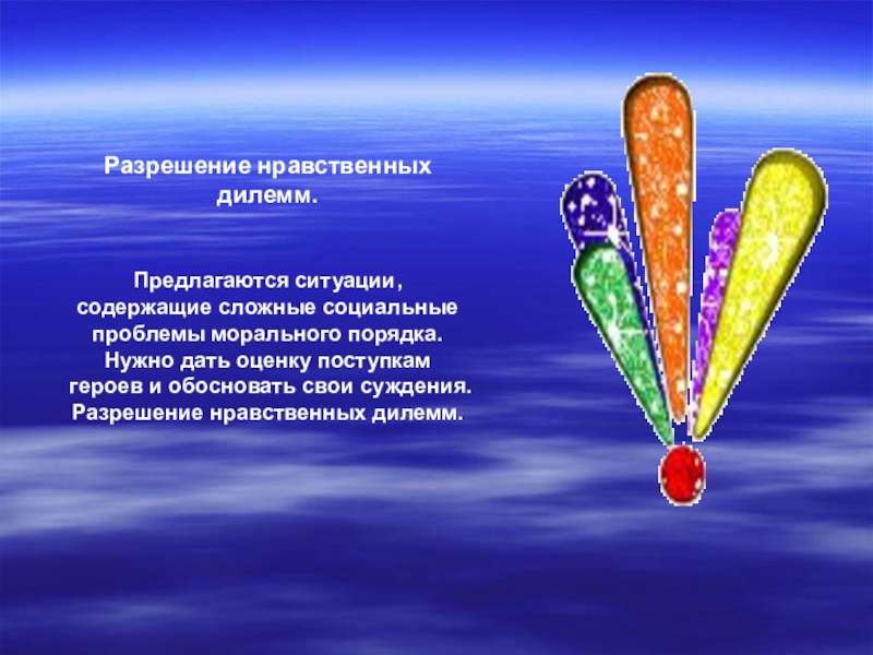 Разрешение нравственных дилемм.Предлагаются ситуации, содержащие сложные социальные проблемы морального порядка. Нужно дать оценку поступкам героев и