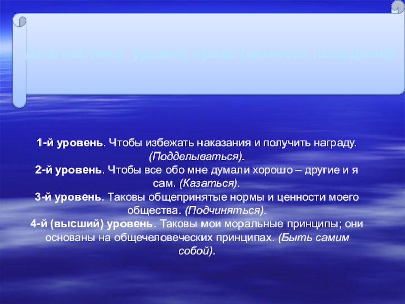 Диагностика уровня нравственного поведения   1-й уровень. Чтобы избежать наказания и получить награду. (Подделываться).
