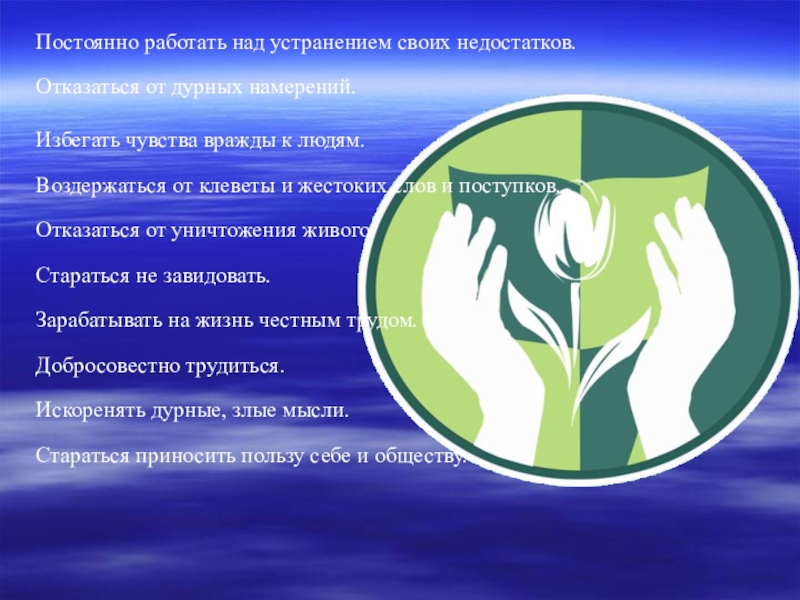 Постоянно работать над устранением своих недостатков.  Отказаться от дурных намерений.  Избегать чувства вражды к