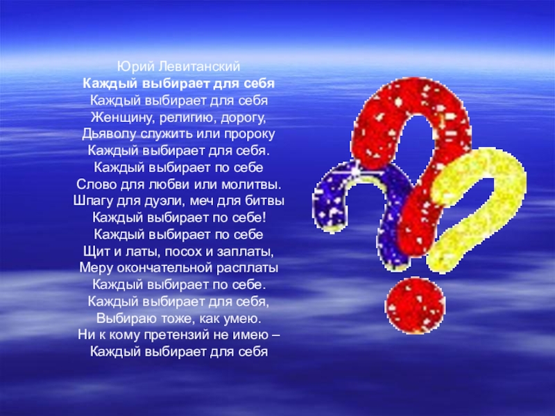 Юрий ЛевитанскийКаждый выбирает для себяКаждый выбирает для себяЖенщину, религию, дорогу,Дьяволу служить или пророкуКаждый выбирает для себя. Каждый выбирает по себеСлово для любви или молитвы.Шпагу для дуэли, меч для битвыКаждый выбирает по себе!Каждый