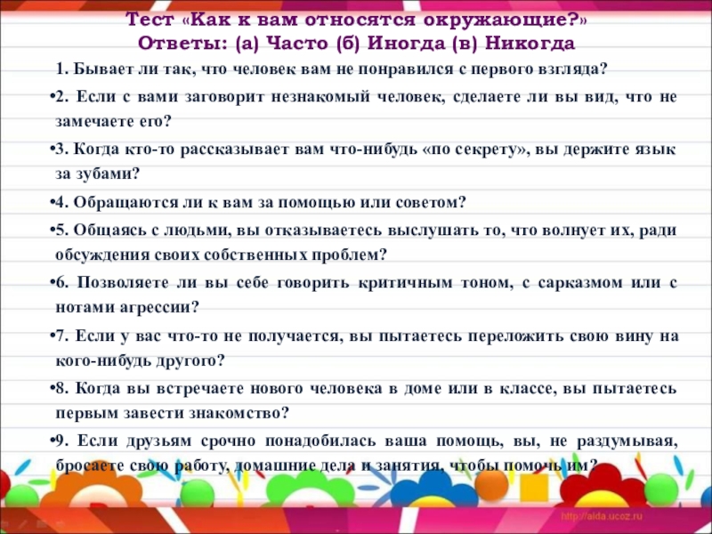 9. Если друзьям срочно понадобилась ваша помощь, вы, не раздумывая, бросаете свою работу, домашние дела и занятия, чтобы помочь им?