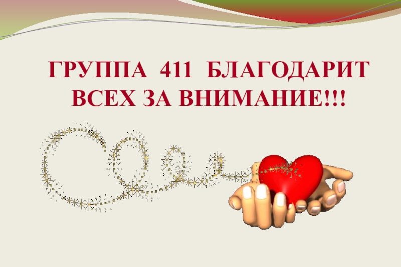 Слайд 33ГРУППА 411 БЛАГОДАРИТ ВСЕХ ЗА ВНИМАНИЕ!!!