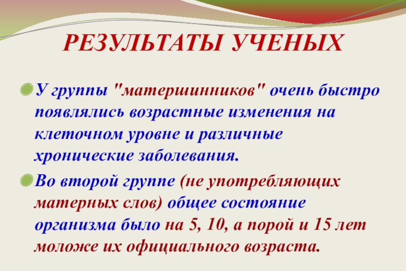 Во второй группе (не употребляющих матерных слов) общее состояние организма было на 5, 10, а порой и 15 лет моложе их официального возраста.