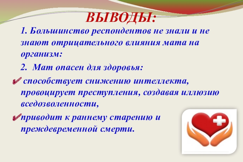 1. Большинство респондентов не знали и не знают отрицательного влияния мата