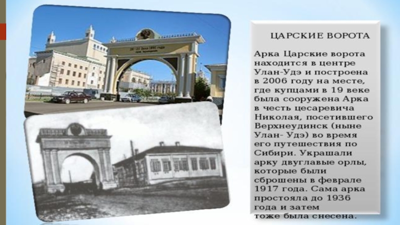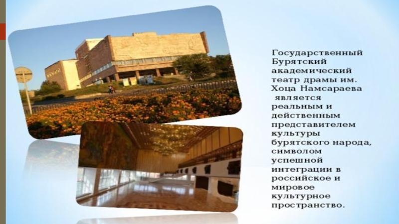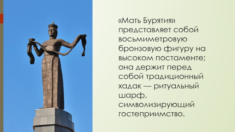 Слайд 11«Мать Бурятия» представляет собой восьмиметровую бронзовую фигуру на высоком постаменте; она