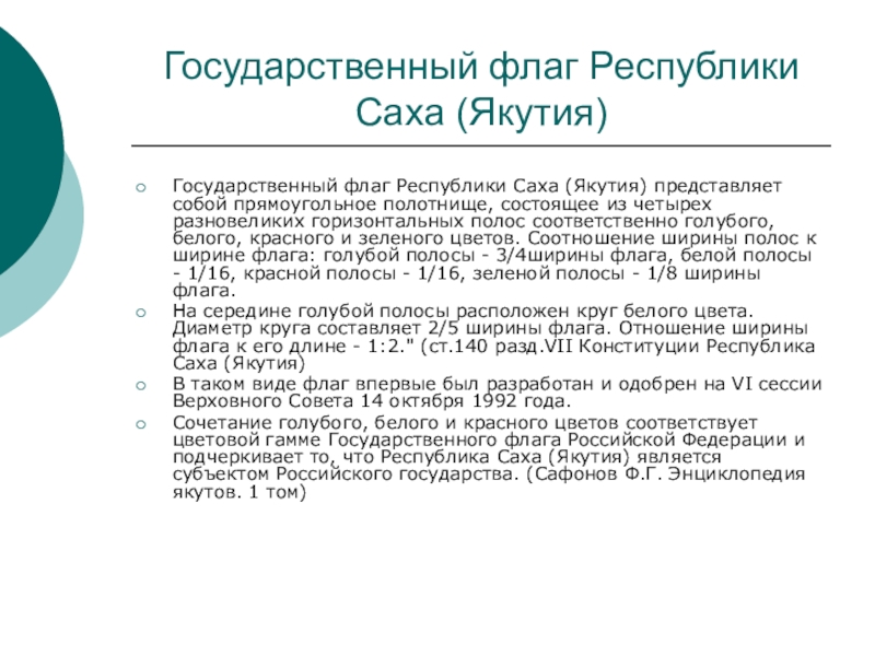 На середине голубой полосы расположен круг белого цвета. Диаметр круга составляет 2/5 ширины флага. Отношение ширины флага к его длине - 1:2." (ст.140 разд.VII Конституции Республика Саха (Якутия)