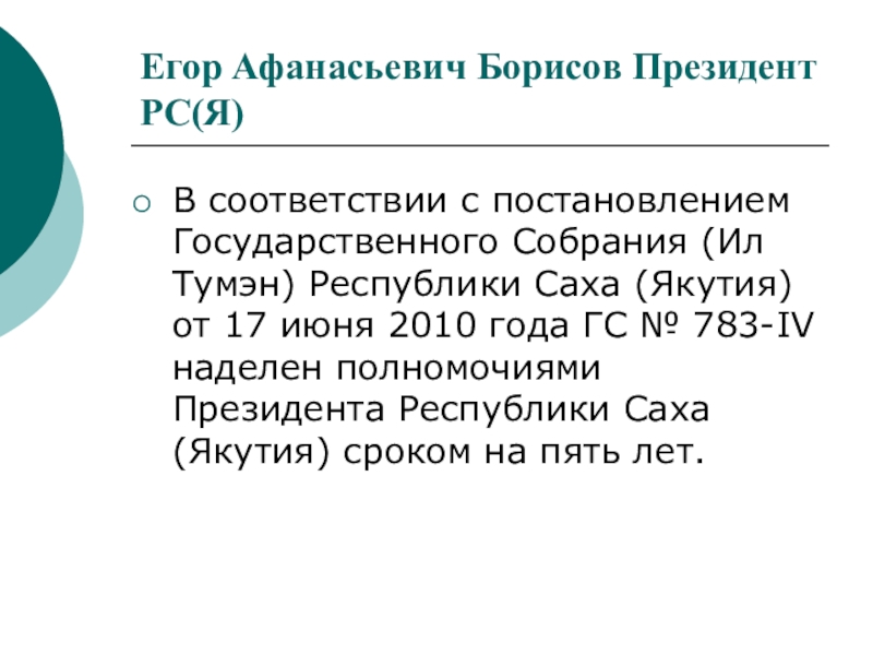 (Ил Тумэн) Республики Саха (Якутия) от 17 июня 2010 года ГС № 783-IV наделен полномочиями Президента Республики Саха (Якутия) сроком на пять лет.