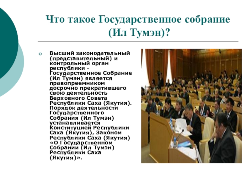 республики - Государственное Собрание (Ил Тумэн) является правопреемником досрочно прекратившего свою деятельность Верховного Совета Республики Саха (Якутия). Порядок деятельности Государственного Собрания (Ил Тумэн) устанавливается Конституцией Республики Саха (Якутия), Законом Республики Саха (Якутия) «О Государственном Собрании (Ил Тумэн) Республики Саха (Якутия)».