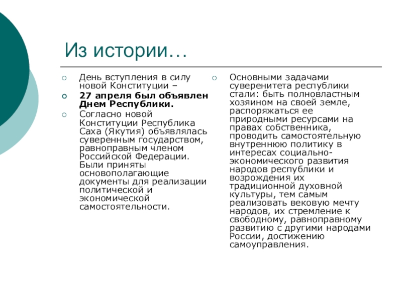 Согласно новой Конституции Республика Саха (Якутия) объявлялась суверенным государством, равноправным членом Российской Федерации. Были приняты основополагающие документы для реализации политической и экономической самостоятельности.