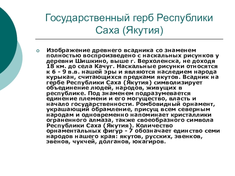 круг, в центре которого изображение древнего всадника со знаменем с наскальных рисунков реки Лены, на фоне солнечного диска - щита, помещенного в обрамление с традиционным национальным орнаментом в виде семи ромбических кристаллообразные фигур и надписями "Республика Саха (Якутия)" и "Саха Республиката".