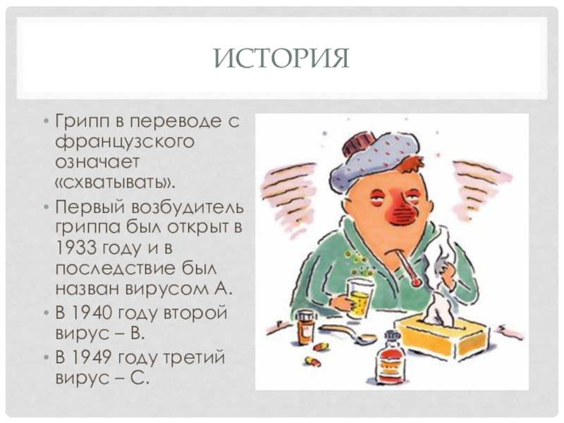 ИсторияГрипп в переводе с французского означает «схватывать».Первый возбудитель гриппа был открыт в 1933 году и в последствие