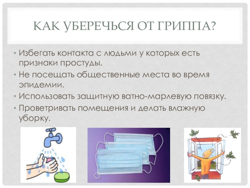 Как Уберечься от гриппа?Избегать контакта с людьми у которых есть признаки простуды.Не посещать общественные места во время