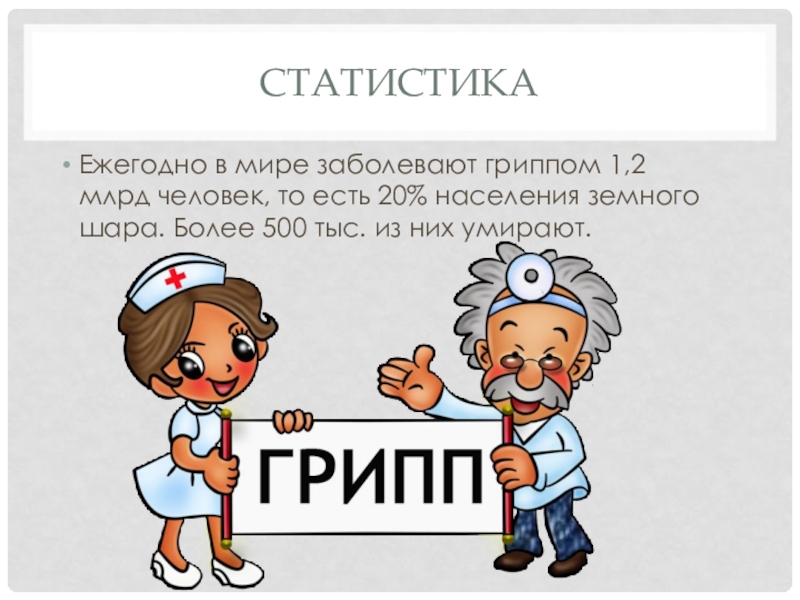 СтатистикаЕжегодно в мире заболевают гриппом 1,2 млрд человек, то есть 20% населения земного шара. Более 500 тыс.