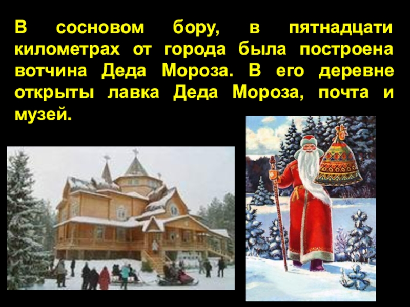 Деда Мороза. В его деревне открыты лавка Деда Мороза, почта и музей.