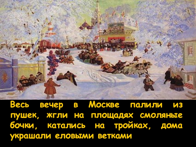 Слайд 12Весь вечер в Москве палили из пушек, жгли на площадях смоляные