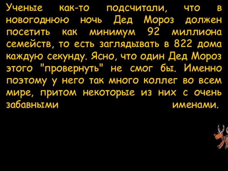Слайд 18Ученые как-то подсчитали, что в новогоднюю ночь Дед Мороз должен посетить