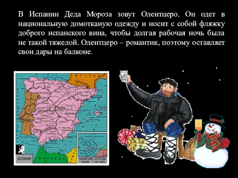 Слайд 22В Испании Деда Мороза зовут Олентцеро. Он одет в национальную домотканую