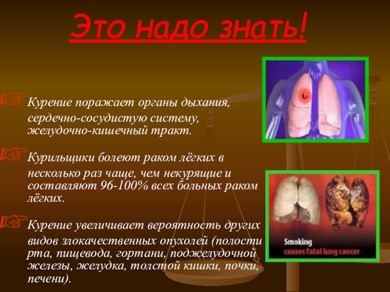 Курение поражает органы дыхания, сердечно-сосудистую систему, желудочно-кишечный тракт.