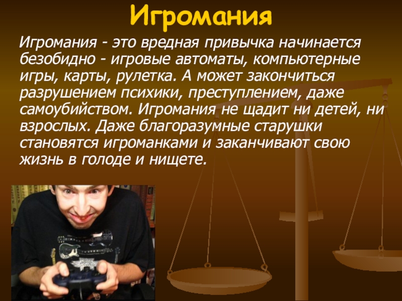 автоматы, компьютерные игры, карты, рулетка. А может закончиться разрушением психики, преступлением, даже самоубийством. Игромания не щадит ни детей, ни взрослых. Даже благоразумные старушки становятся игроманками и заканчивают свою жизнь в голоде и нищете.